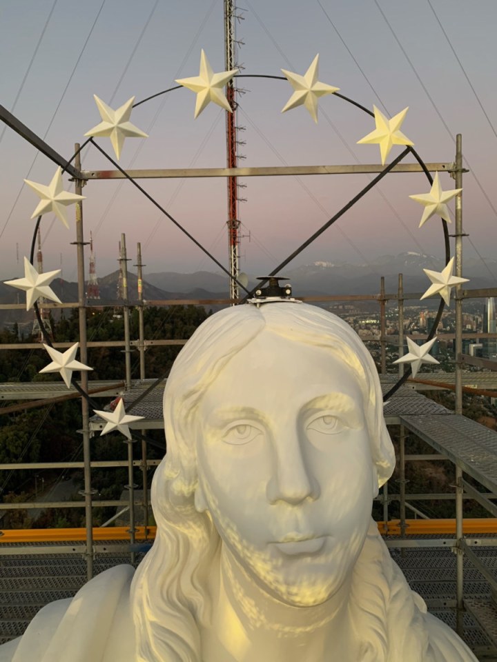 De esta manera describe el momento Cristián Sáez, arquitecto de Sáez-Joannon Arquitectos. Este hombre es el que estuvo a cargo de la restauración de la imagen de 14 metros de alto -más la base que le suma otros ocho- y que data de 1908. La Inmaculada domina la ciudad de Santiago desde la cumbre del Cerro San Cristóbal.