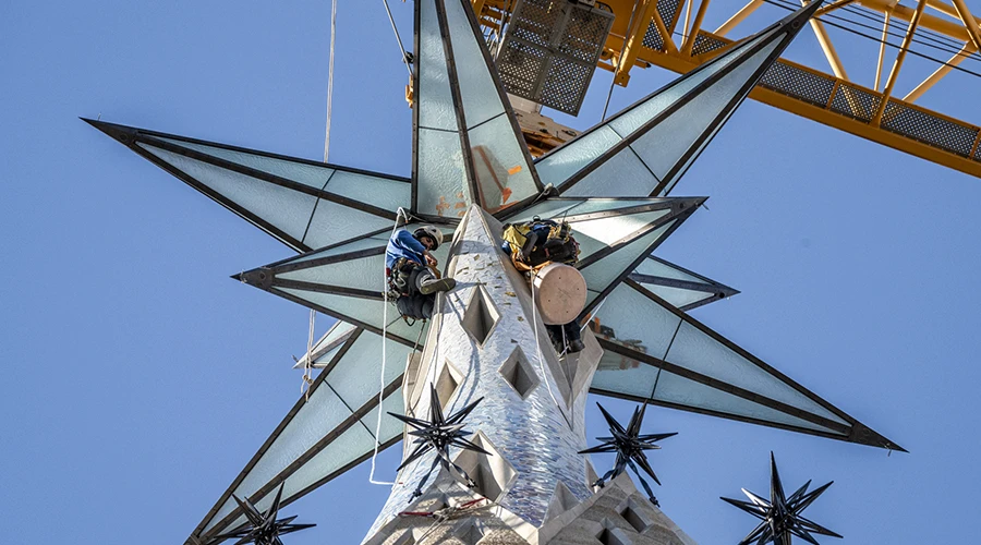 La estrella, que mide 7,5 metros, tiene un peso de 5,5 toneladas y es de vidrio texturizado. Es la última pieza que corona la torre de la Virgen María.