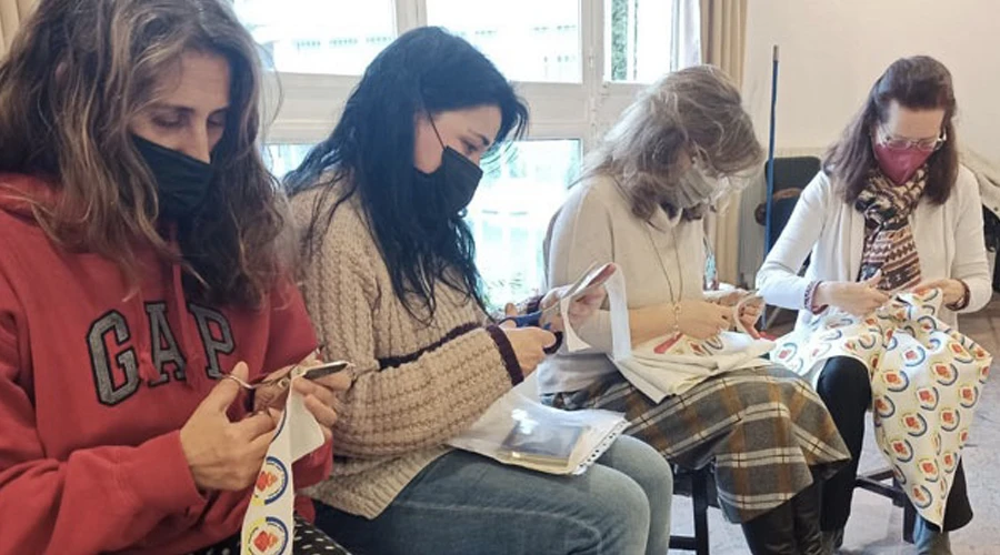 Miembros de los Apóstoles de los corazones de Jesús y María y más de cincuenta voluntarios han confeccionado esos ‘detentes’ cortando, plastificando y empaquetandolos junto a una oración a la Virgen en ucraniano, mientras otras voluntarias rezaban el Rosario.